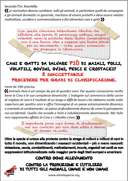Da una parte ci sentiamo solidali verso quei cani - non auguriamo a nessun* di essere catturat* e macellat*! -. Dall’altra abbiamo temuto per i contenuti che avrebbero potuto emergere dalla protesta, visto che si scendeva in piazza contro uno sterminio compiuto da parte di individui riconducibili ad un popolo, quello cinese, che in Italia è spesso oggetto di odio razziale. Come possiamo pretendere di impartire loro lezioni di civiltà, quando quotidianamente accade lo stesso negli allevamenti e nei mattatoi nostrani, solo ad altri tipi di animali (come mucche, galline, maiali)?
